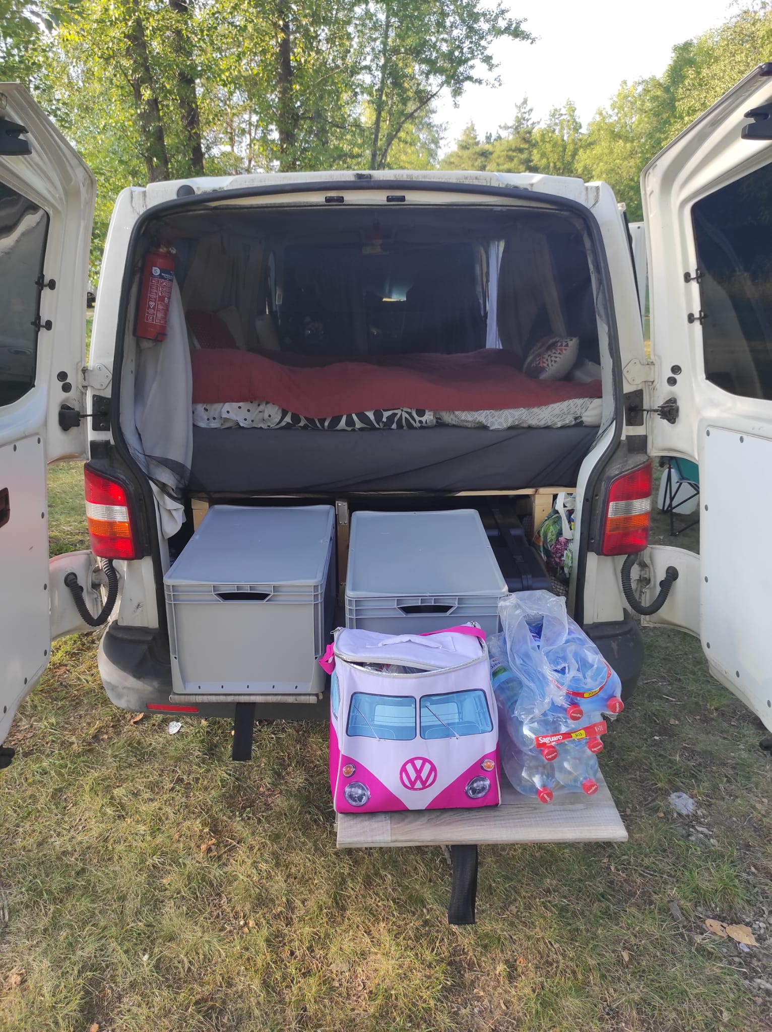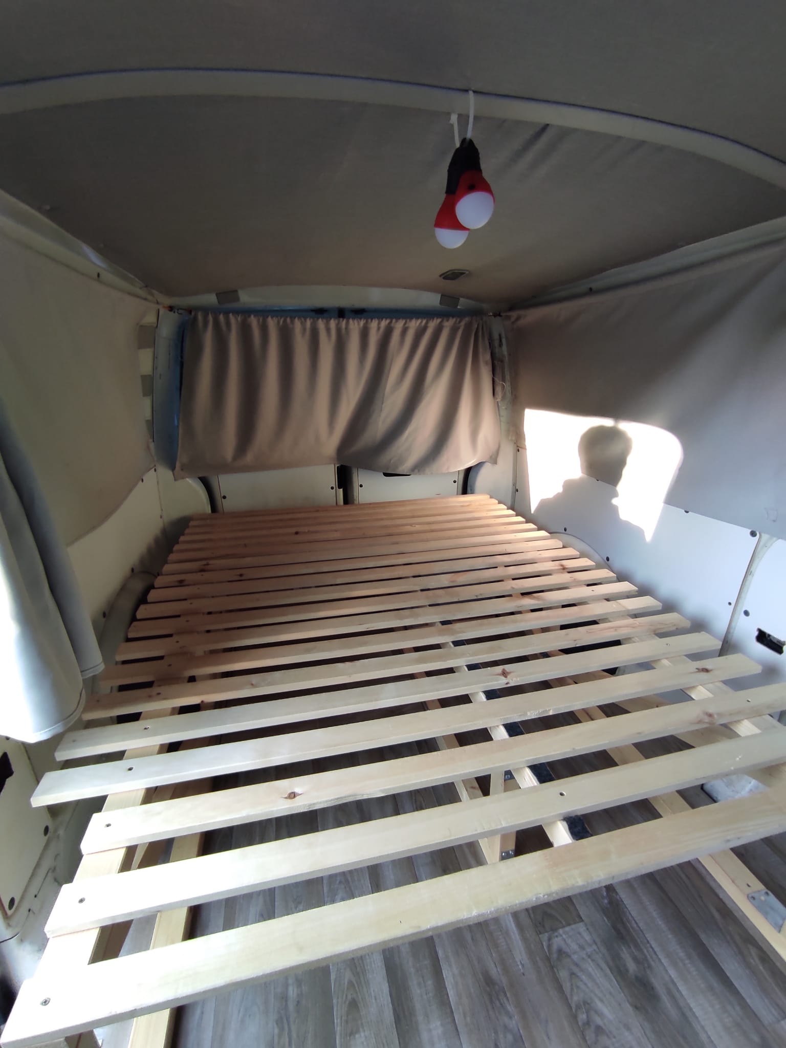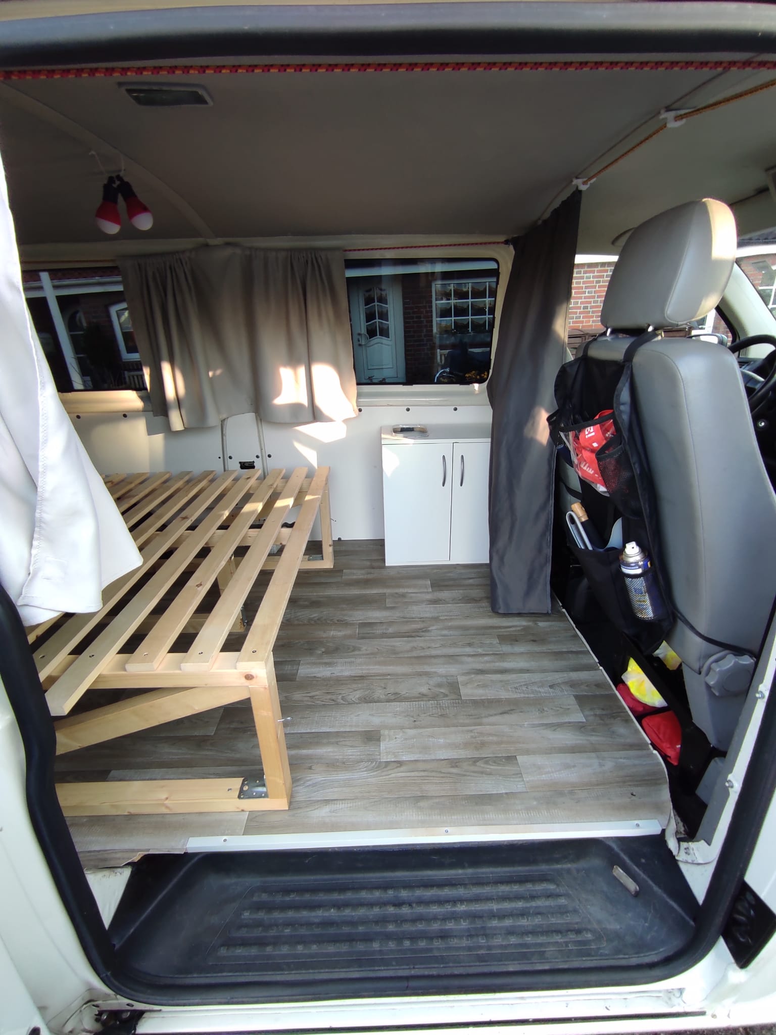 Camper Ausbau: Bodenplatte aus dicker Pressspanplatte, PVC Bodenbelag, Bettgestell für 1,60 Matratze, kleiner Schrank, zwei ausziehbare Böden für links eine Eurobox (40x60cm), rechts drei Euroboxen (auch als Tisch nutzbar), rundum passende Verdunklungsgardinen mit Magneten, Decke mit Stoff bezogen und Lichterkette „Sternenhimmel Optik“, alle Fenster hinten sind mit Verdunklungsfolie überzogen für Privatsphäre, passende Fliegennetze für die vorderen Fenster, unterm Bettgestell ist Platz für 8 Euroboxen (40x60cm). Alle Wände wurden mit Armaflex Isoliert