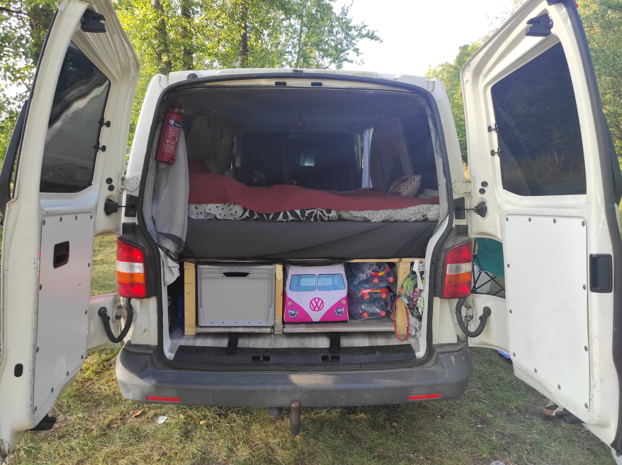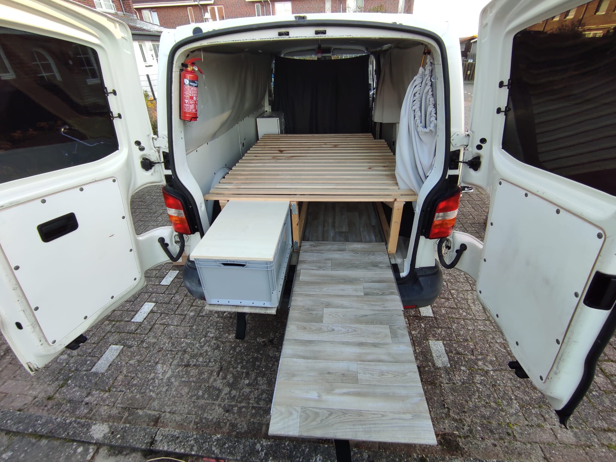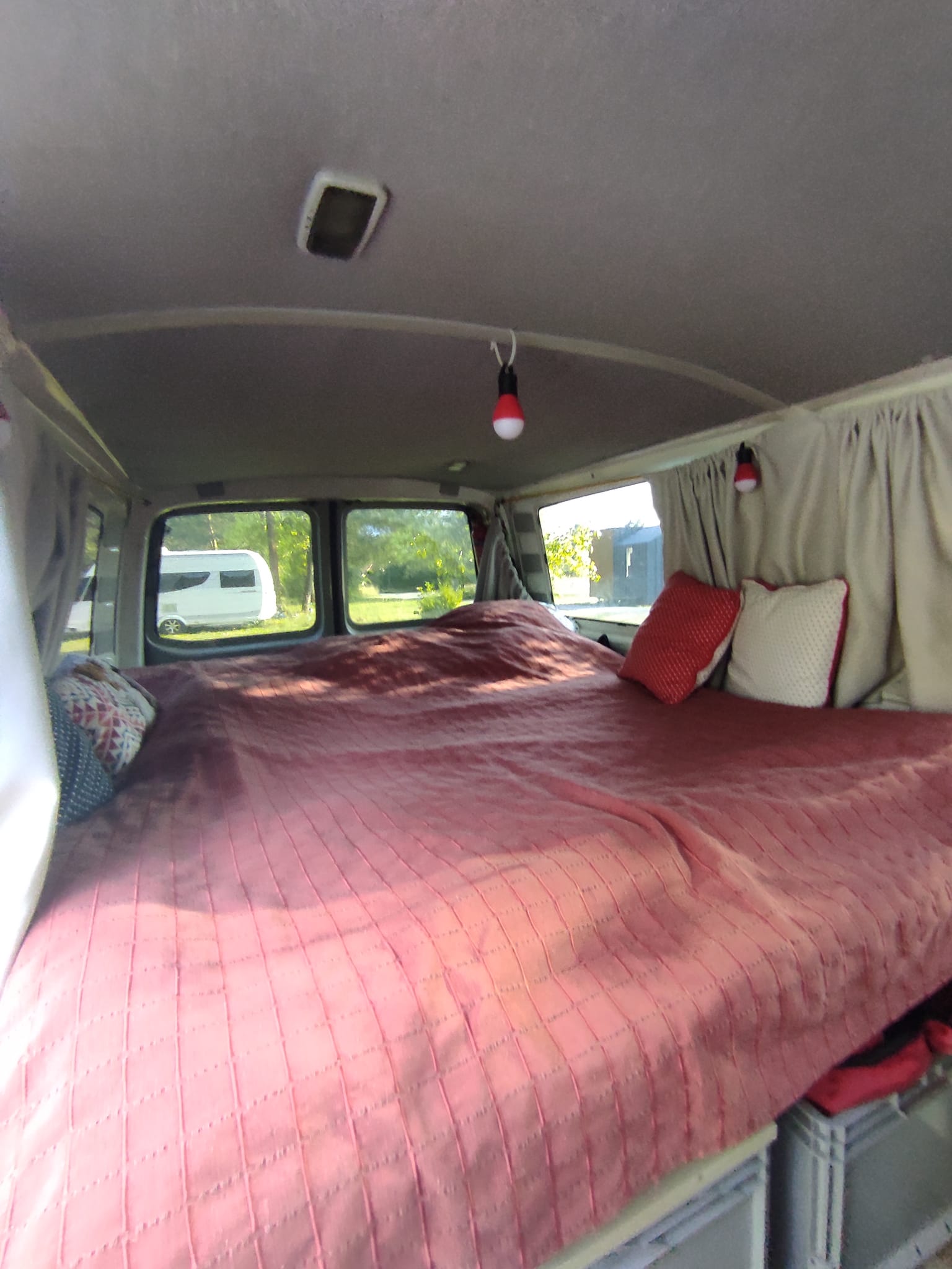 Camper Ausbau: Bodenplatte aus dicker Pressspanplatte, PVC Bodenbelag, Bettgestell für 1,60 Matratze, kleiner Schrank, zwei ausziehbare Böden für links eine Eurobox (40x60cm), rechts drei Euroboxen (auch als Tisch nutzbar), rundum passende Verdunklungsgardinen mit Magneten, Decke mit Stoff bezogen und Lichterkette „Sternenhimmel Optik“, alle Fenster hinten sind mit Verdunklungsfolie überzogen für Privatsphäre, passende Fliegennetze für die vorderen Fenster, unterm Bettgestell ist Platz für 8 Euroboxen (40x60cm). Alle Wände wurden mit Armaflex Isoliert